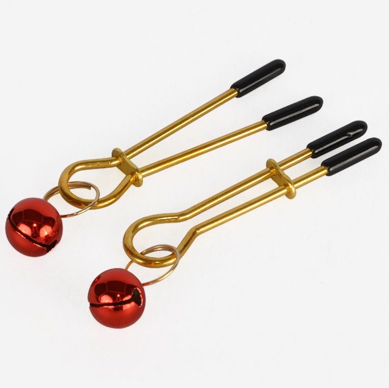 Золотистые зажимы с колокольчиками Gold. Зажимы имеют регулятор и полимерные наконечники на концах. Подвески в виде круглых колокольчиков. Привнесут в вашу БДСМ-игру капельку озорства.