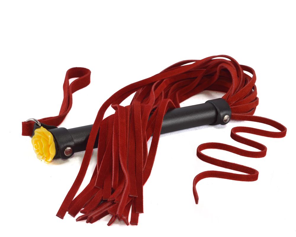Плеть изготовлена из натуральной велюровой кожи. Торец металлической рукояти украшена акриловой розой. Количество лент в хвосте 25-26. Длина рукояти - 17 см.